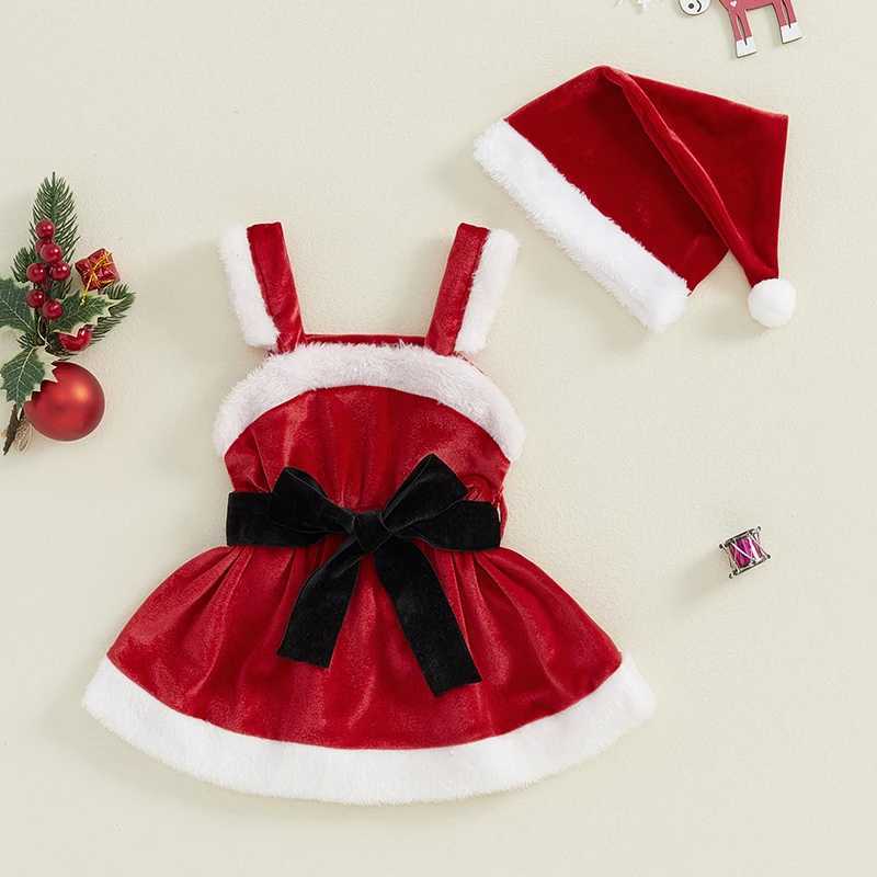 0-3 Years Baby Girls Christmas Dress Velvet Terry Trim Bow Waistband Sleeveless A-Line Cami Dress Hat Outfits Q251210
