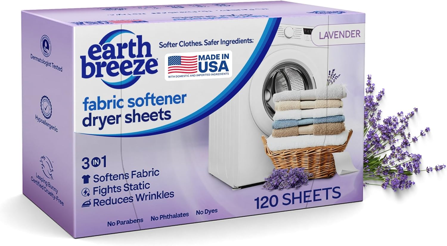 Lavender-Scented Fabric Softener Dryer Sheets Product is a premium, Lavender-scented fabric softener dryer sheet made in the USA with domestic and imported ingredients. Used for softening fabrics, reducing static, and minimizing wrinkles in everyday home laundry. | 3-in-1 Performance for Everyday Laundry Capable of softening, fighting static, and reducing wrinkles on clothes, towels, and bedding of all fabrics. Used to keep laundry soft, reduce wrinkles, and fight static with reliable results every cycle. Works with all dryer types and temperatures. | A Better Alternative to Liquids and Dryer Balls Used as an alternative to traditional liquid softeners or dryer balls. It is a premium, hypoallergenic, non-toxic sheet, with safe ingredients (no dyes, parabens, preservatives), that enhances laundry comfort | Simple to Use, Compatible with All Dryers Used in laundry rooms and laundromats. Just place one sheet in the dryer with wet laundry — that’s it! Used with any dryer, including HE, for maximum softening power. Designed for effortless performance in every load. | Safe, Sustainable Laundry Care for Conscious Families Used by conscious consumers who value sustainable products with no harsh chemicals (dyes, parabens, preservatives). Unlike traditional polyester dryer sheets that shed microplastics, Earth Breeze dryer sheets are plant based and microplastic free, designed for those interested in safe, non-toxic laundry care, who want to keep their clothes soft and fresh.
