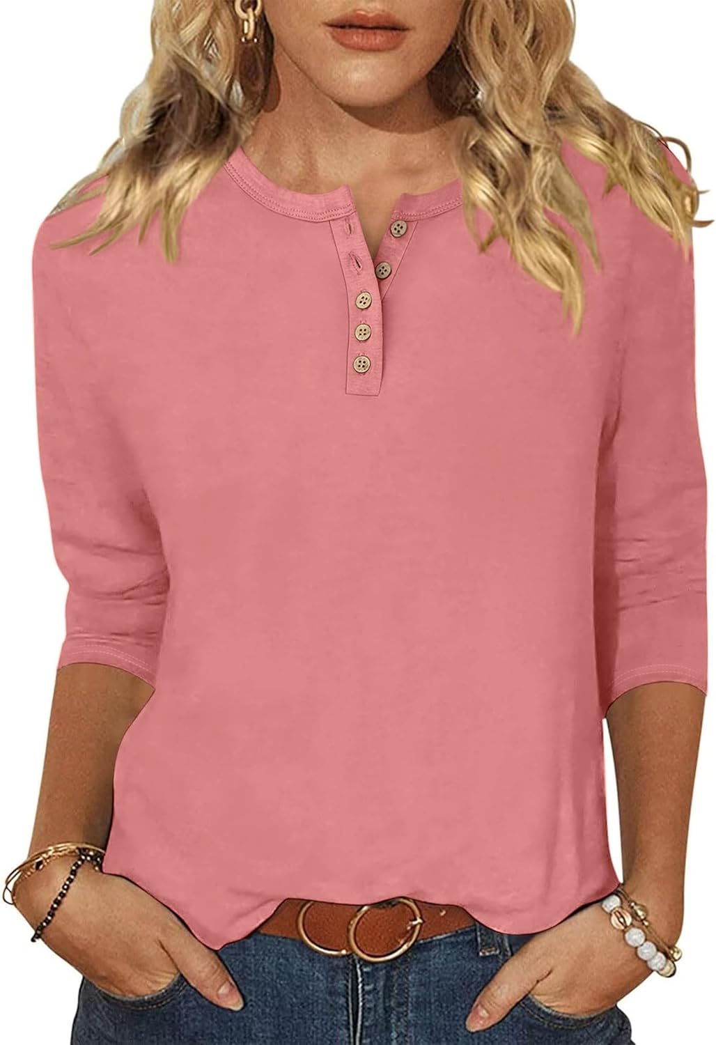 Womens 3/4 Sleeve Tops Henley Shirts Casual Trendy Button T Shirts 2026 Summer Basic Tunic